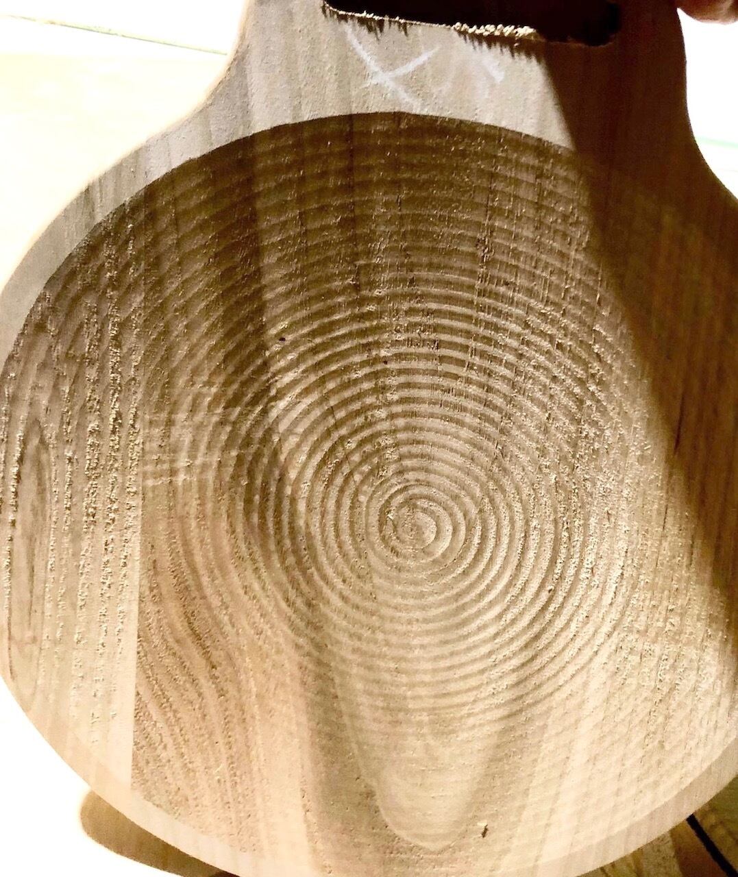 写真4枚目→ 座彫加工(製作中写真)・・・座面の凹み加工を施し、ここから滑らかに研磨 してゆきます。座り心地の為の大切な工程。